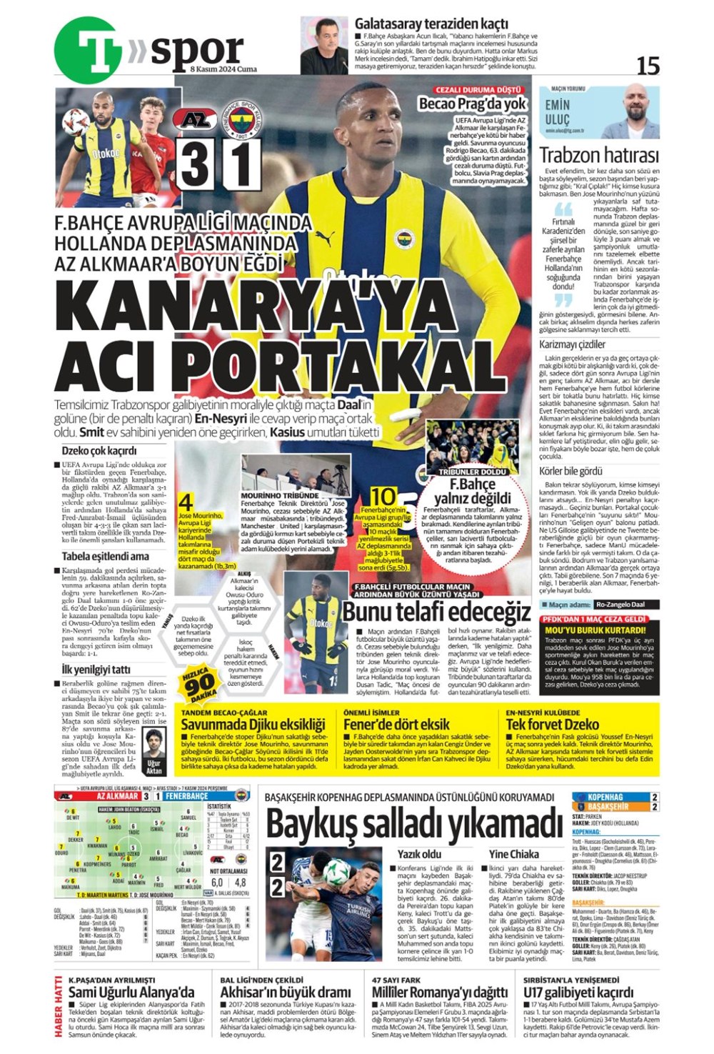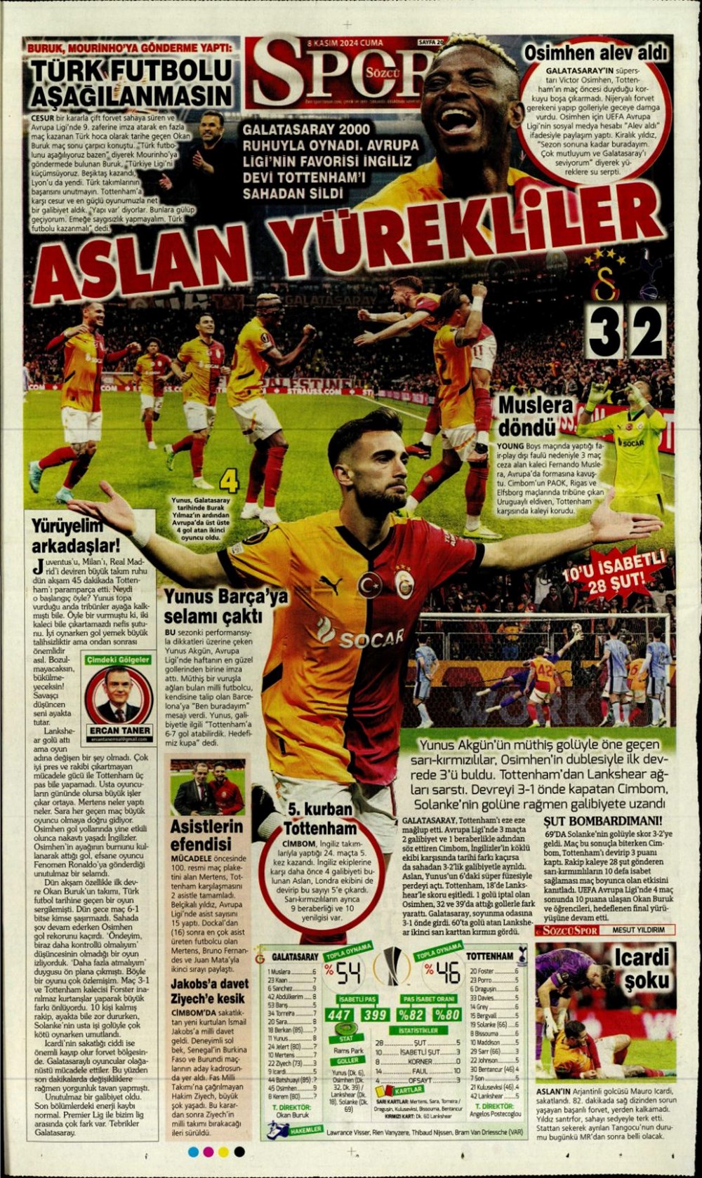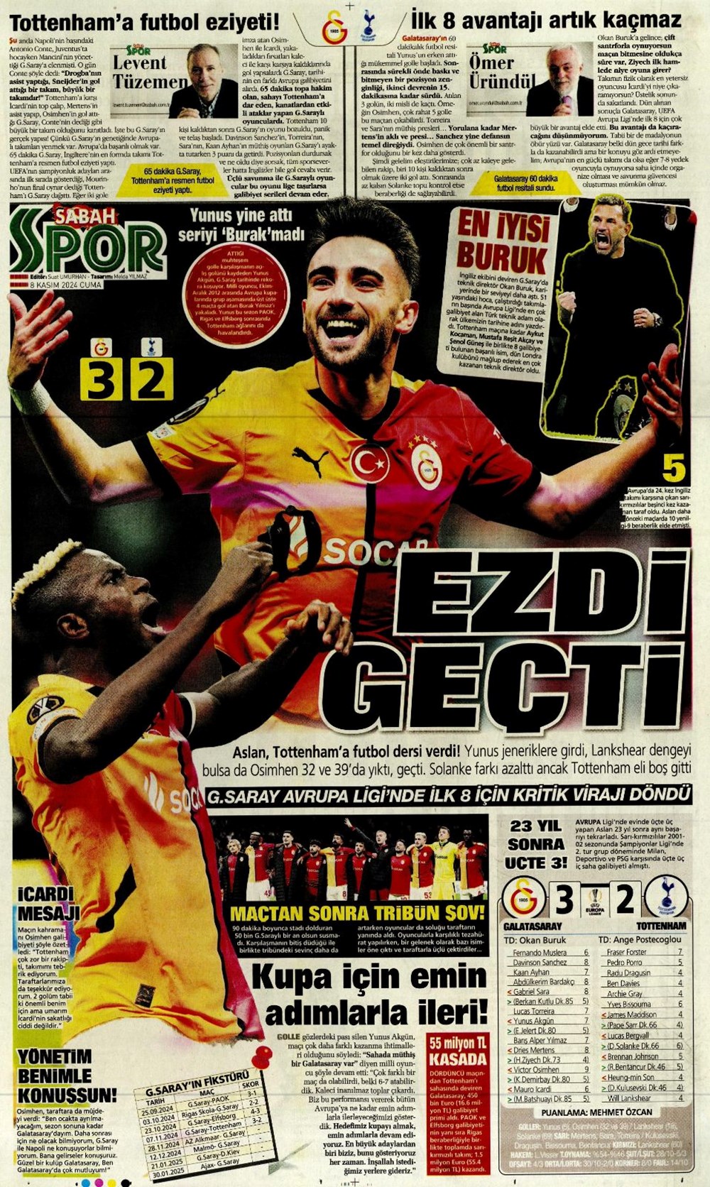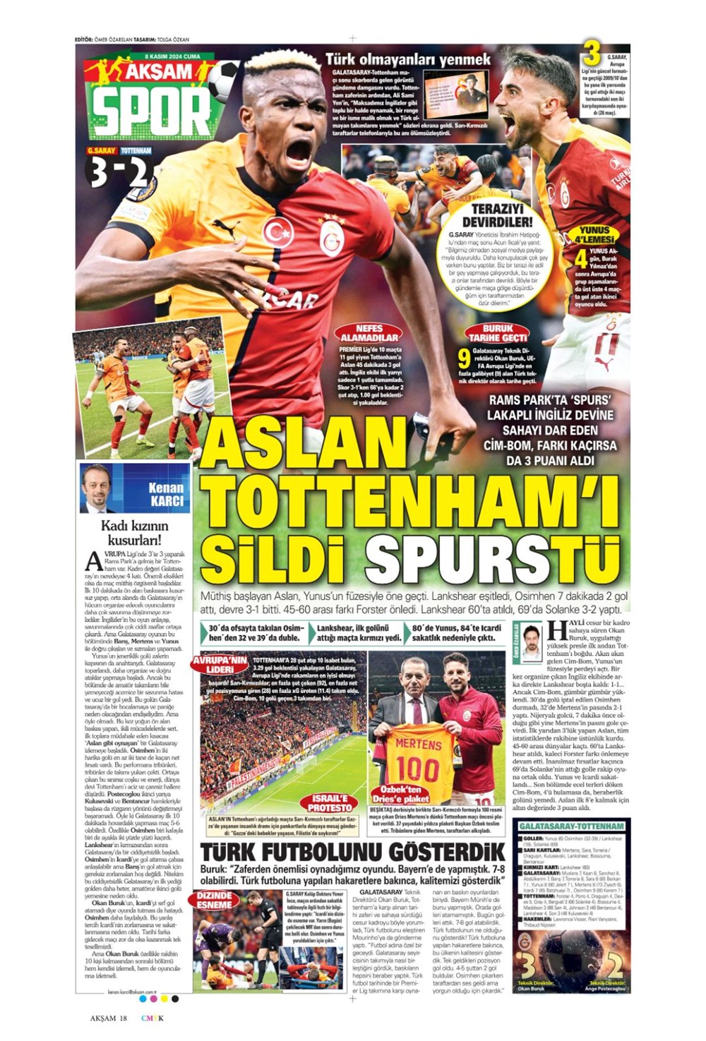 “Aslan üzere zafer” (8 Kasım 2024 spor manşetleri)