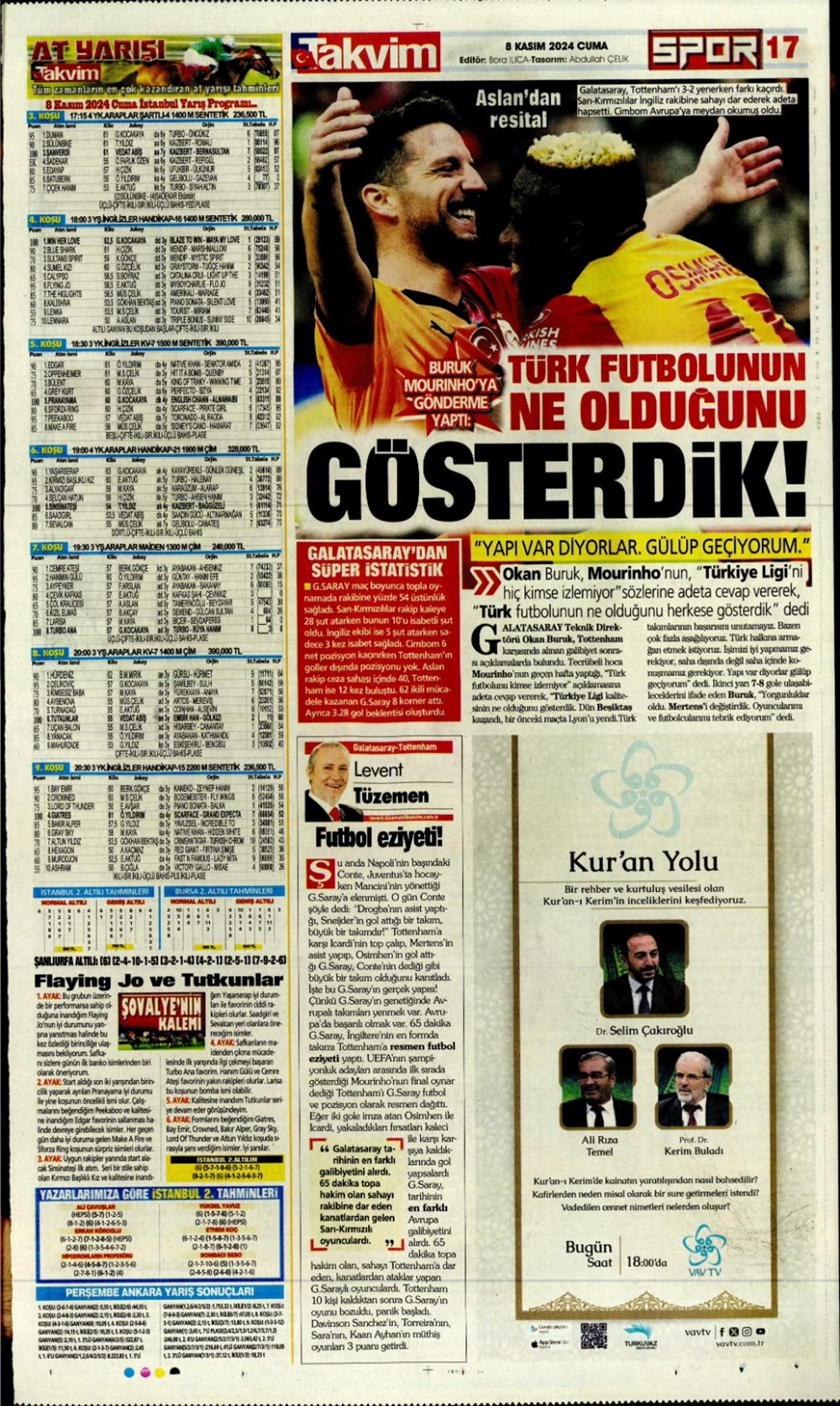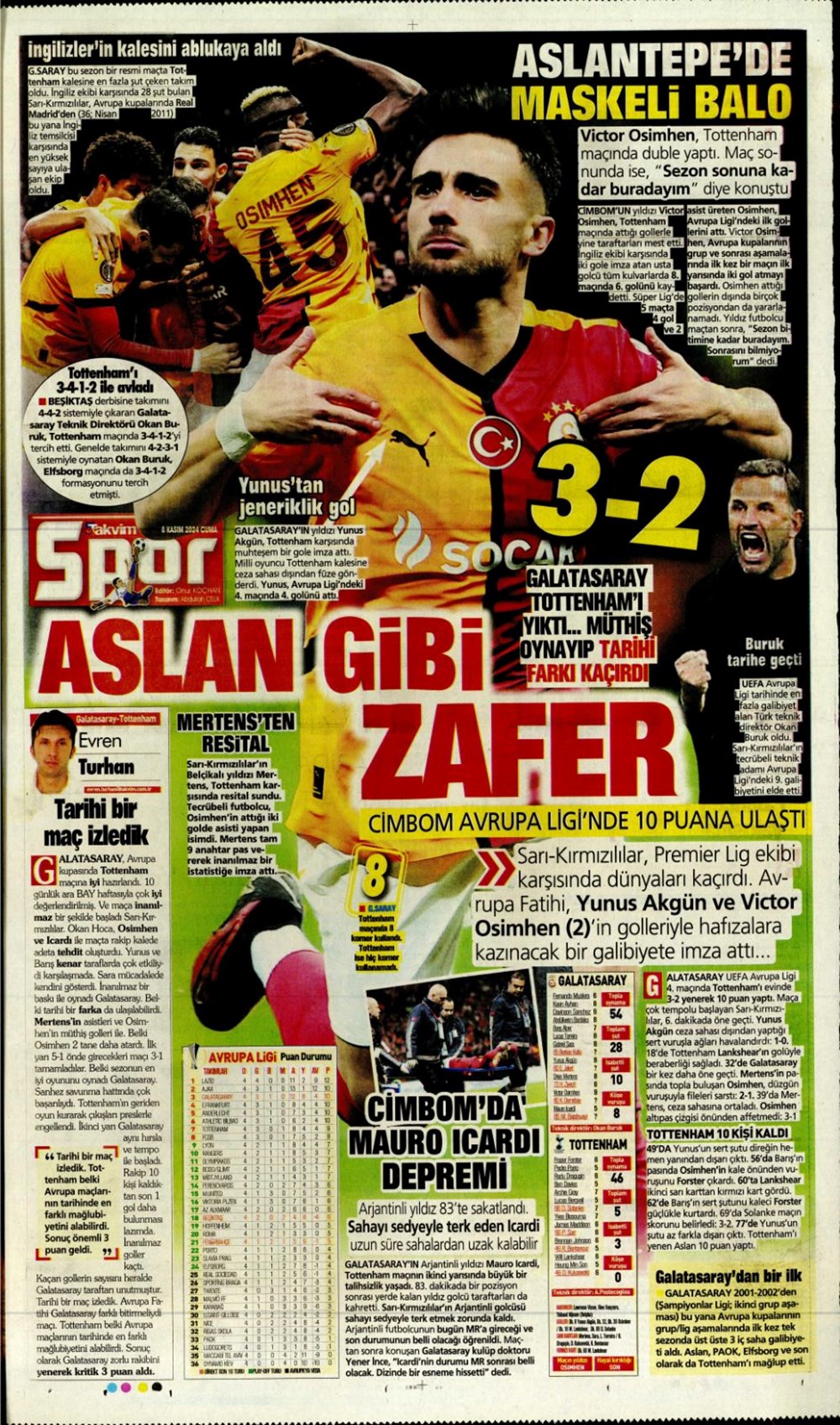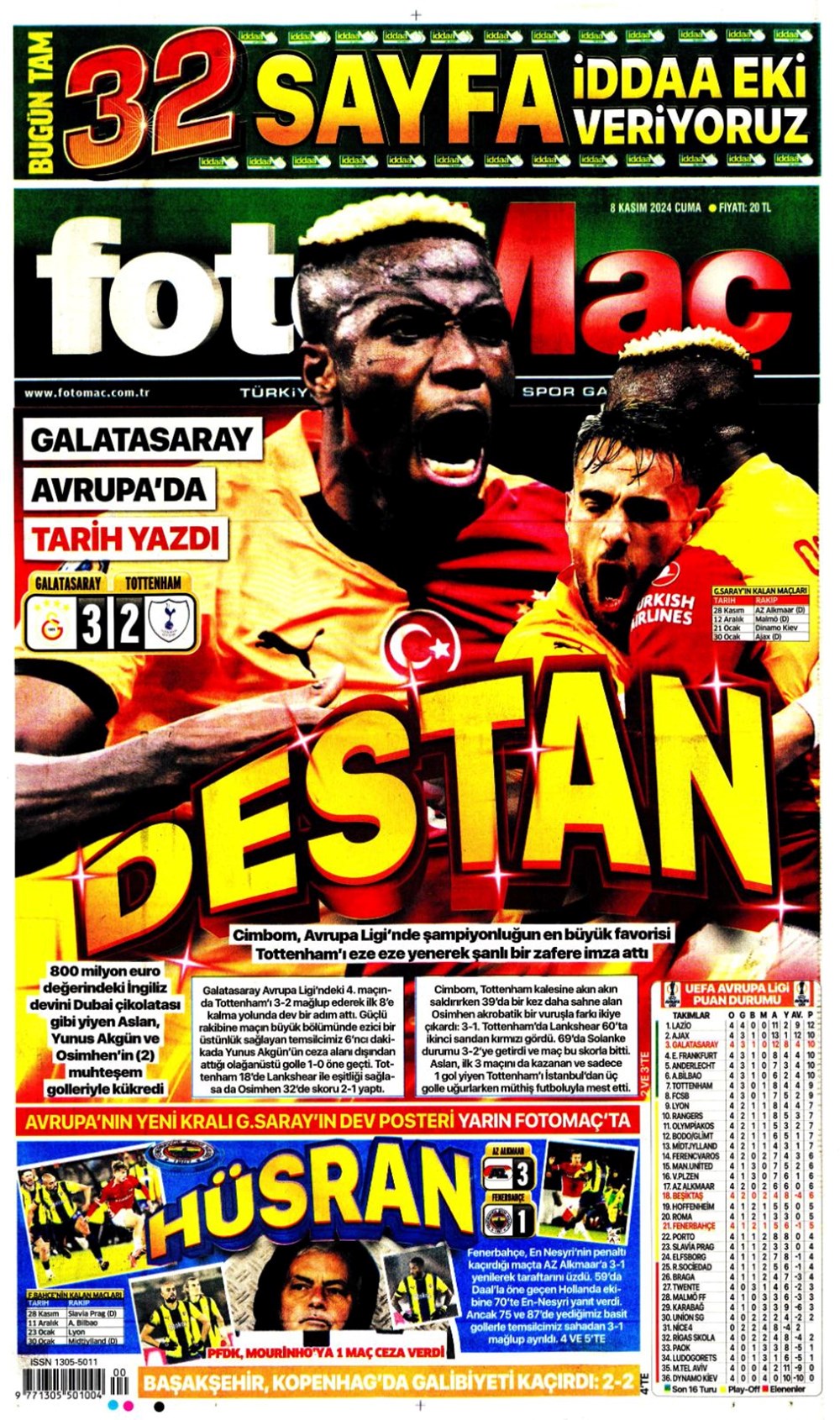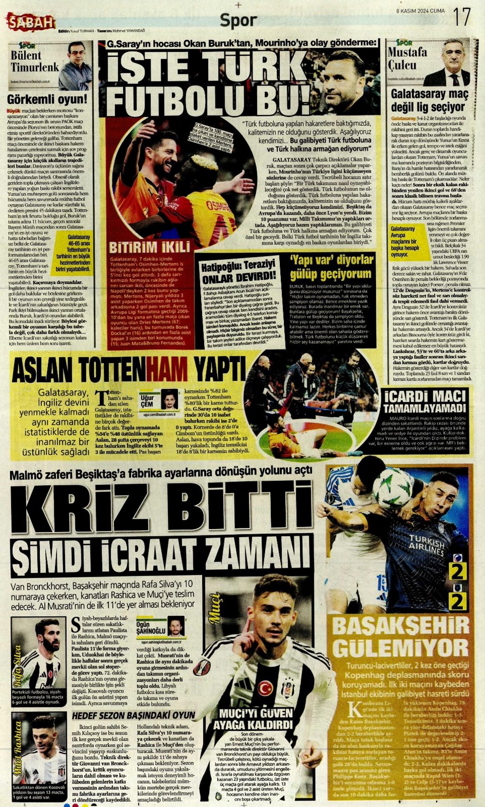 “Aslan üzere zafer” (8 Kasım 2024 spor manşetleri)