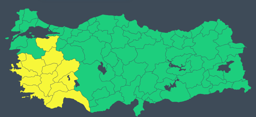 MGM; Afyonkarahisar, Antalya, Aydın, Burdur, Bursa, Denizli, Isparta, İzmir, Kütahya, Manisa, Muğla ve Uşak için sarı kodlu ikaz yayınladı.