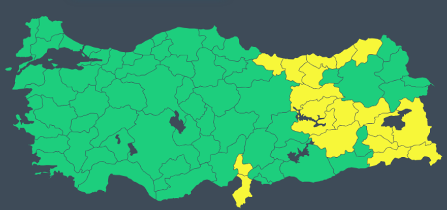 MGM; Artvin, Bingöl, Bitlis, Diyarbakır, Elazığ, Erzincan, Giresun, Gümüşhane, Hakkari, Hatay, Muş, Ordu, Rize, Siirt, Trabzon, Tunceli, Van, Şırnak ve Osmaniye için sarı kodlu sağanak, kar ve fırtına uyarısı yaptı.