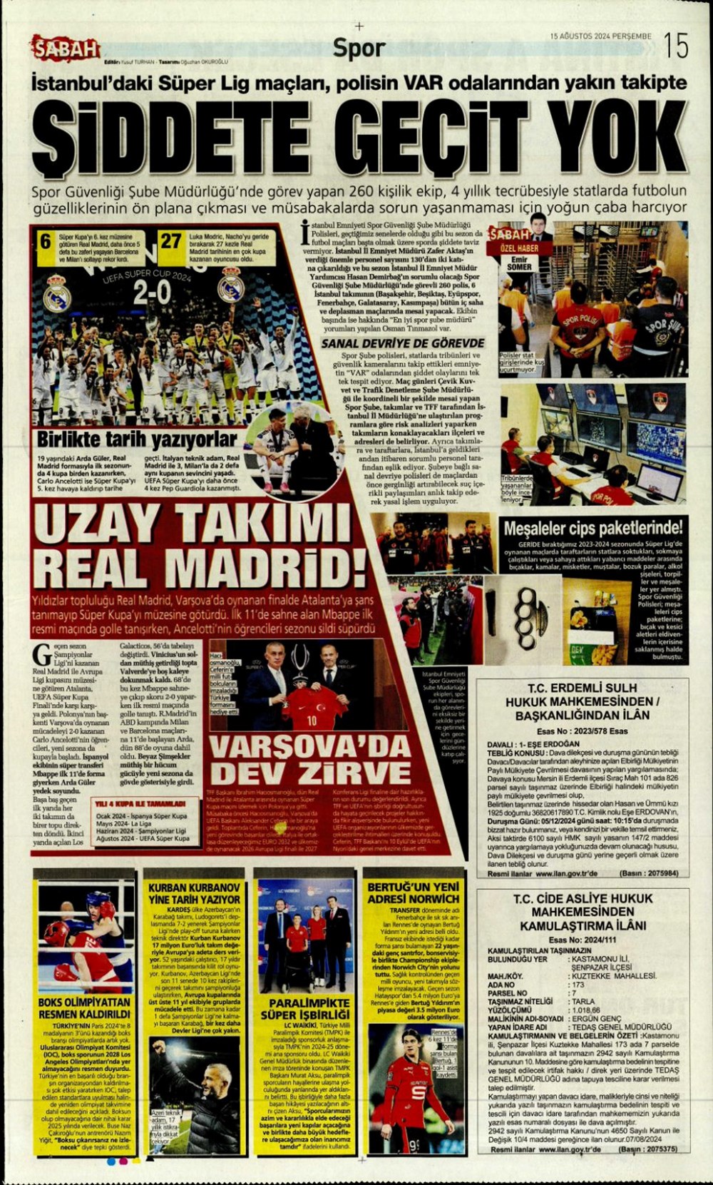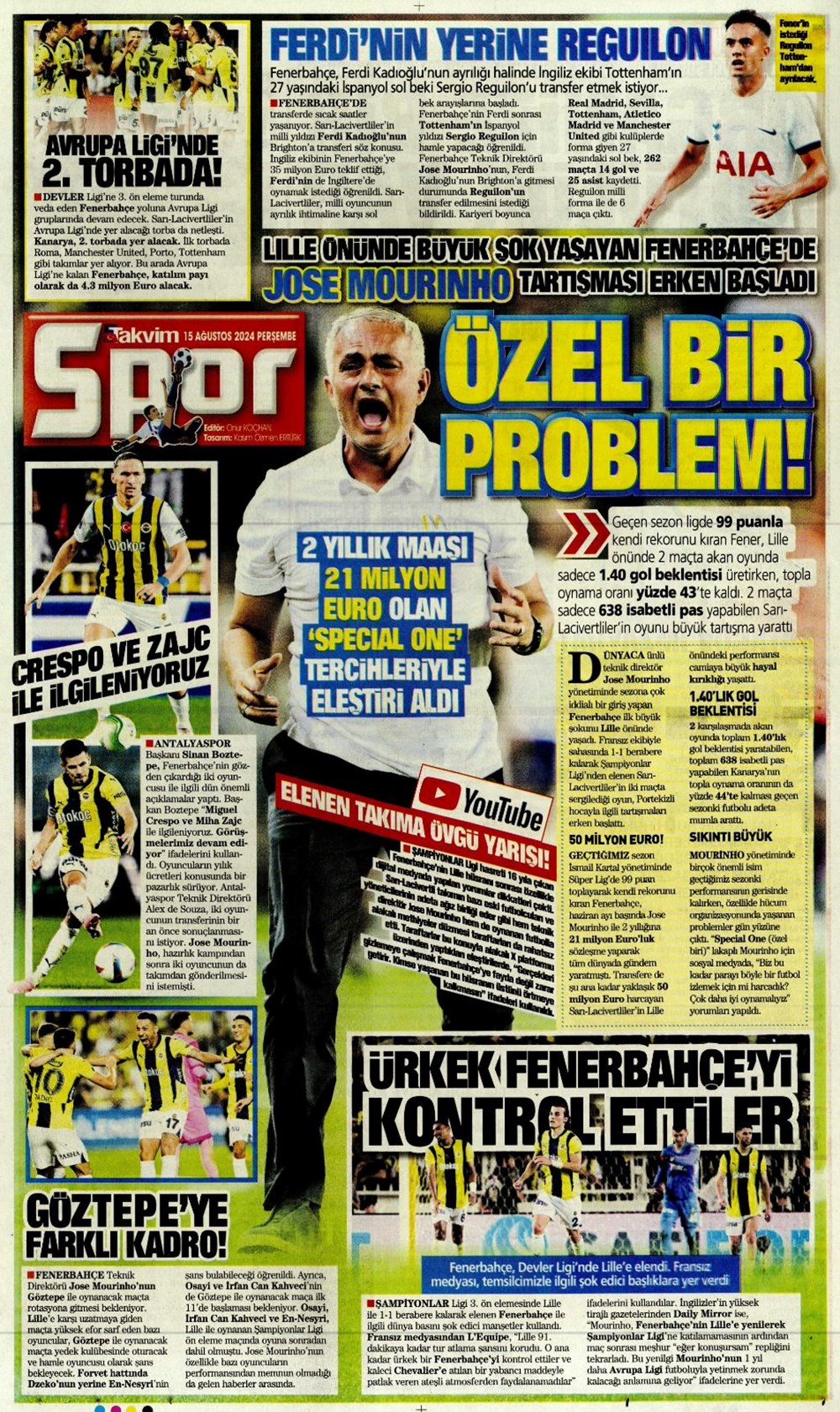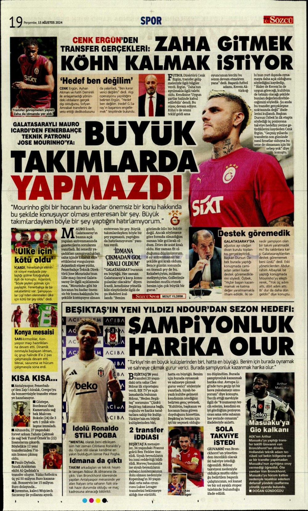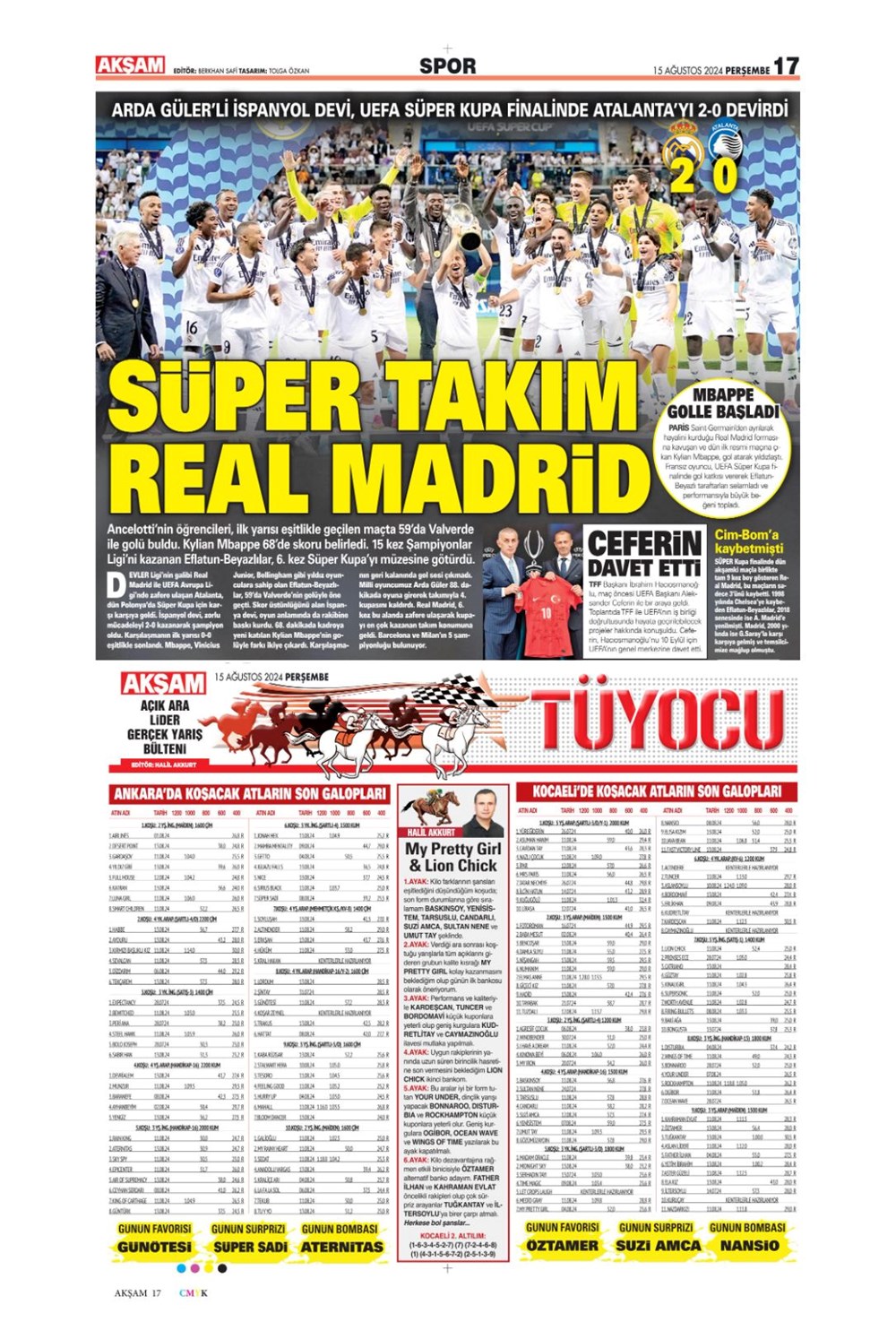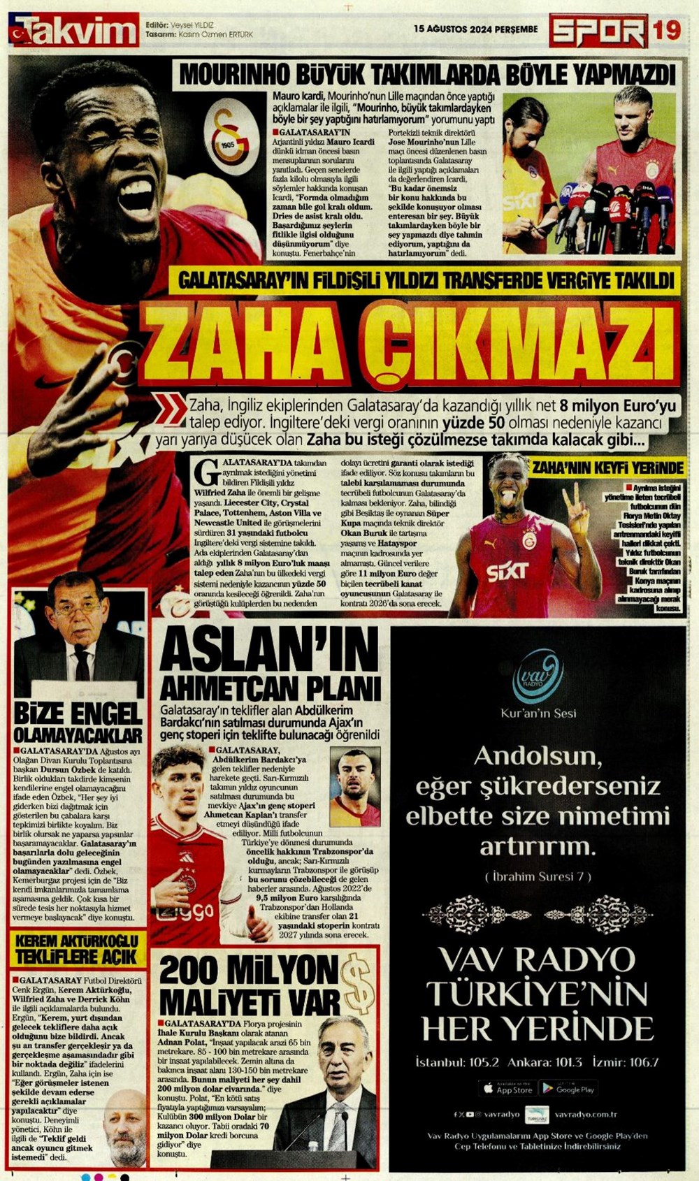 “Devler Ligi elden kaçtı” (14 Ağustos 2024 spor manşetleri)