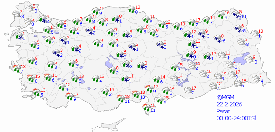 Meteoroloji Genel Müdürlüğü’nün (MGM) bilgilerine nazaran bugün Batı ve Doğu Karadeniz, Orta Karadeniz kıyıları, Doğu ve Güneydoğu Anadolu ile Ankara’nın kuzeyi, Sivas, Hatay, Osmaniye ve Kahramanmaraş etraflarında aralıklı yağış bekleniyor. Yağışların, Artvin kıyılar ve Rize etraflarında kuvvetli olması bekleniyor.