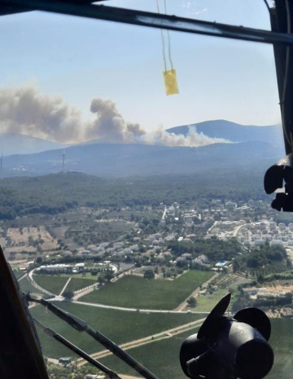 İhbar üzerine bölgeye İzmir Orman Bölge Müdürlüğüne bağlı 2 uçak, 3 helikopter, 13 arazöz, 3 su ikmal aracı, 2 dozer ve 4 yer grubu sevk edildi.