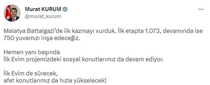 Bu kapsamda Bakan Kurum, sosyal medya hesabından yeni bir paylaşımda bulundu.